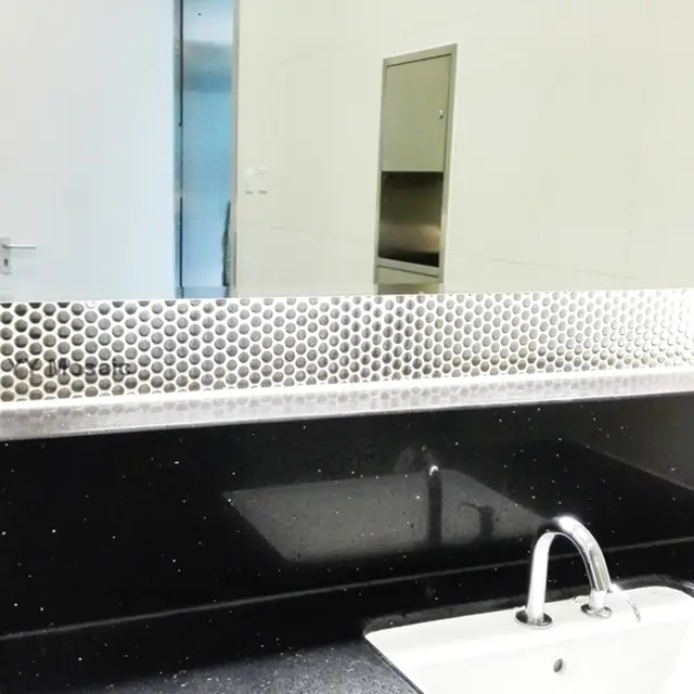 Stainless steel penny round backsplash. Arched wall sconce for contemporary powder room and brown bowl sink see more. Reflection mirror stainless steel metal penny round mosaic backsplash wall tile. It is great to install in kitchen backsplashes bathrooms and any decorated spot in your home.