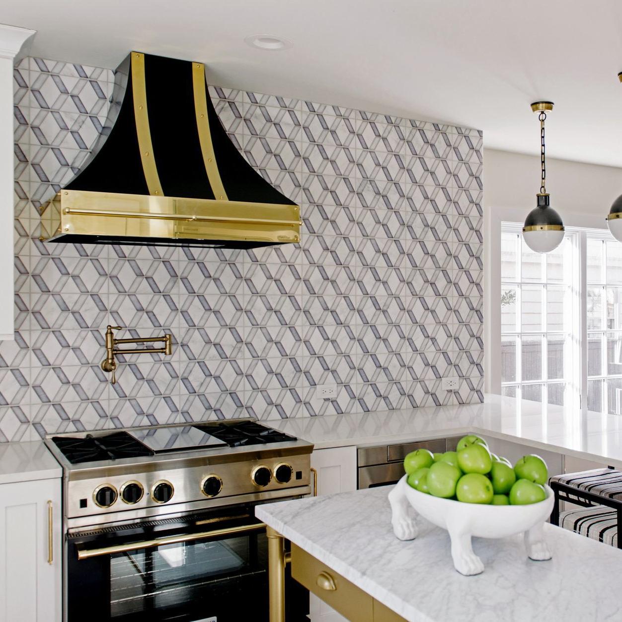 White Oak Gray Marble Mosaic Textured Herringbone Backsplash