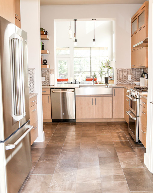 Contemporary Kitchen With Slab Door And Honeycomb Backsplash