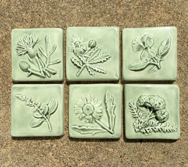 Ceramic Accent Tile Little Flowers Set Of 6 In Green Tea Etsy