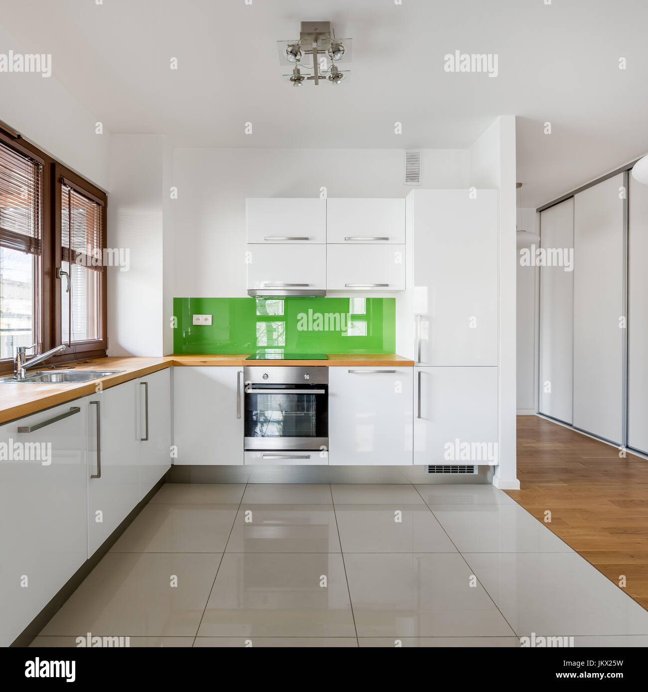 Modern White Kitchen With Green Backsplash And Long Window Stock